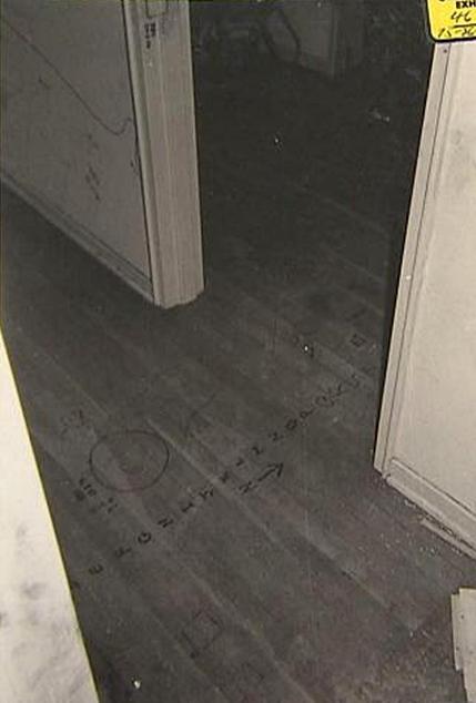 Bloody footprints of Jeffrey MacDonald in the hallway, exiting the bedroom of Kristen MacDonald.<BR><BR>CID Exhibit D217 (floorboards marked F through K, circled at left) was made by MacDonald's left foot.  The print was made in human blood, but typing was precluded due to the paucity or contamination of the stain.