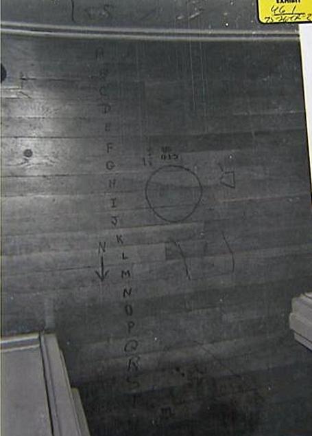 Bloody footprints of Jeffrey MacDonald in the hallway, exiting the bedroom of Kristen MacDonald.<BR><BR>CID Exhibit D217 (floorboards marked F through K, circled in center) was made by MacDonald's left foot.  The print was made in human blood, but typing was precluded due to the paucity or contamination of the stain.<BR><BR>CID Exhibit D216 is marked in a square below Exhibit D217, while CID Exhibit D215, the left footprint of Jeffrey MacDonald in Type A blood (the blood type of Colette MacDonald) is partially visible at bottom (floorboards marked Q through Z).